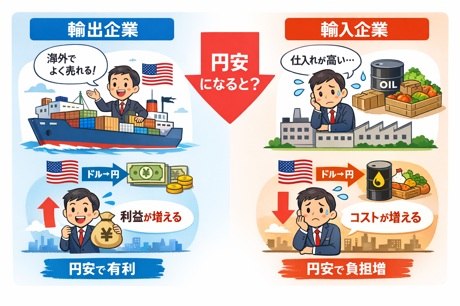 一方で、原材料や商品を海外から仕入れる輸入企業は、仕入れコストが上がりやすくなります。